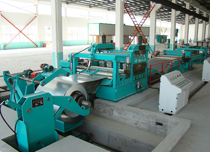 該生產(chǎn)線是將較薄金屬卷板整平、剪切成塊狀板材的專用設(shè)備。通常由上料小車、開卷機(jī)、托板壓引裝置、校平主機(jī)、活動過橋、導(dǎo)向糾偏裝置、定尺機(jī)構(gòu)、覆膜裝置、剪板機(jī)、輸送工作臺、氣動排料架、液壓升降垛料臺、運料滾道臺及液壓系統(tǒng)、電氣控制系統(tǒng)等組成,協(xié)同動作PLC控制。